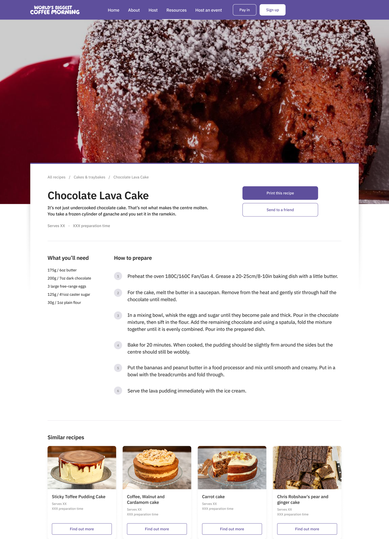 The recipe detail page was designed to be visually striking yet functional; a bold, full-width image of the featured bake sets the scene, while the body content overlaps the image to create a modern, inviting look. Key actions such as sharing/printing are placed front and centre, making it effortless for participants to share recipes or simply to bring a printed copy into their kitchen.