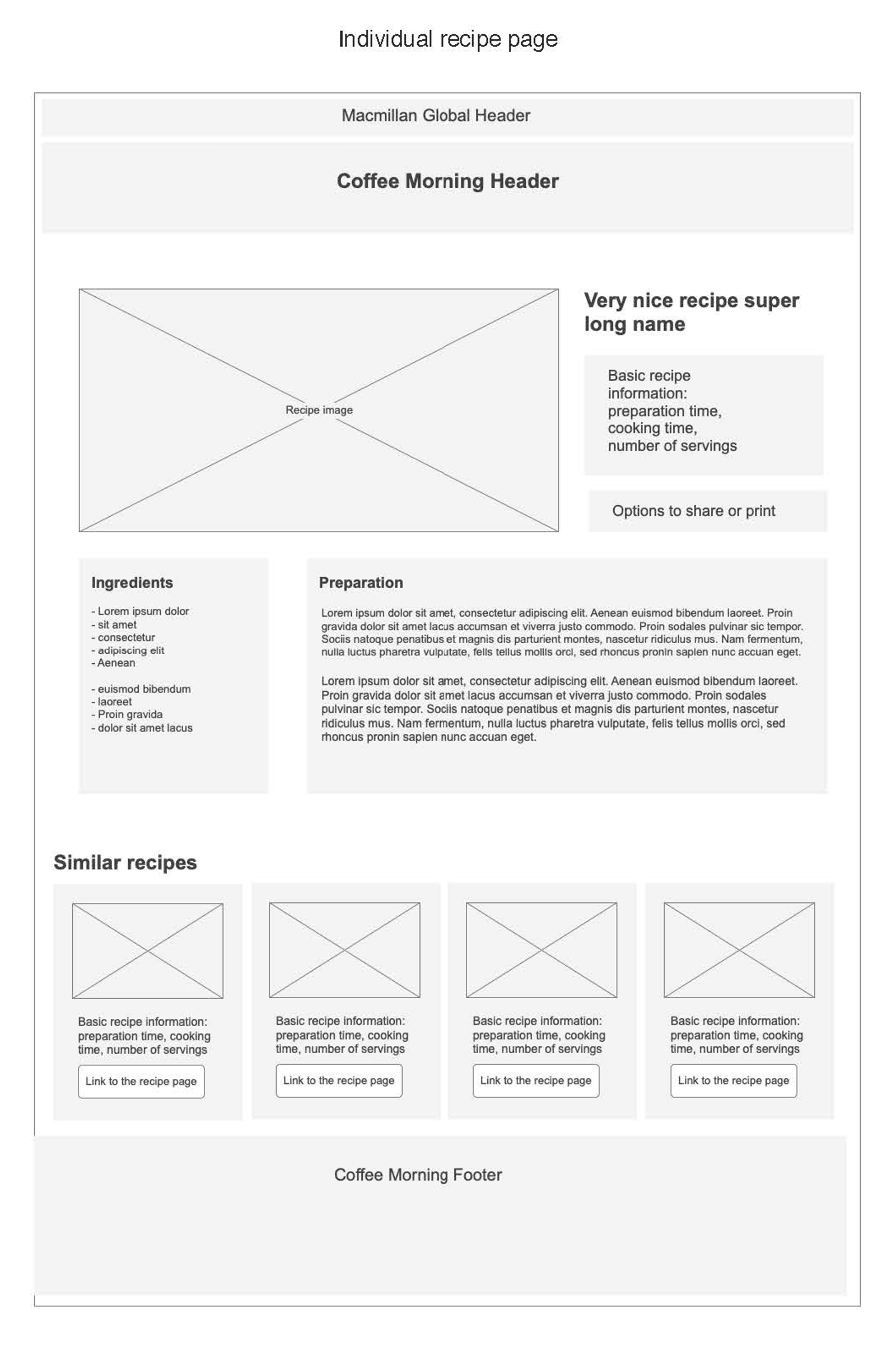 The the recipe detail page, the wireframes focused on clarity and usability: a well-organised list of ingredients and measurements, easy-to-follow preparation steps, and convenient sharing options. To encourage further discovery and help prevent potential drop-off, a list of similar recipes was also included before the footer.